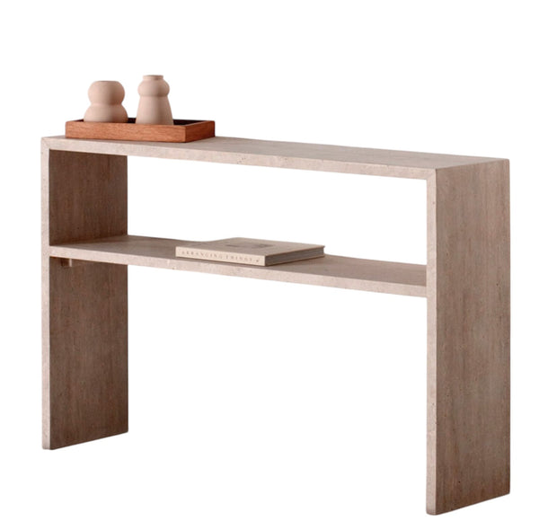 Le design minimaliste est au cœur de la console Carolina Le résultat est le fruit de la puissance et du savoir-faire ancestral. Une console au design qui s'adaptera facilement à toutes sortes de décorations et trouvera aisément sa place dans votre intérieur. Un travail bien fini. Le travertin est protégé par un imperméabilisant. Chaque pièce est créée dans nos ateliers par nos artisans, ce qui garantit son caractère unique!