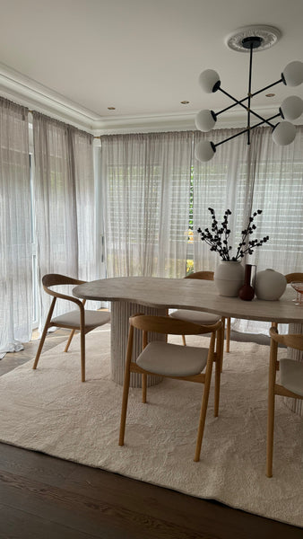 Table de salle à manger en travertin asymétrique en forme wavy/vague.